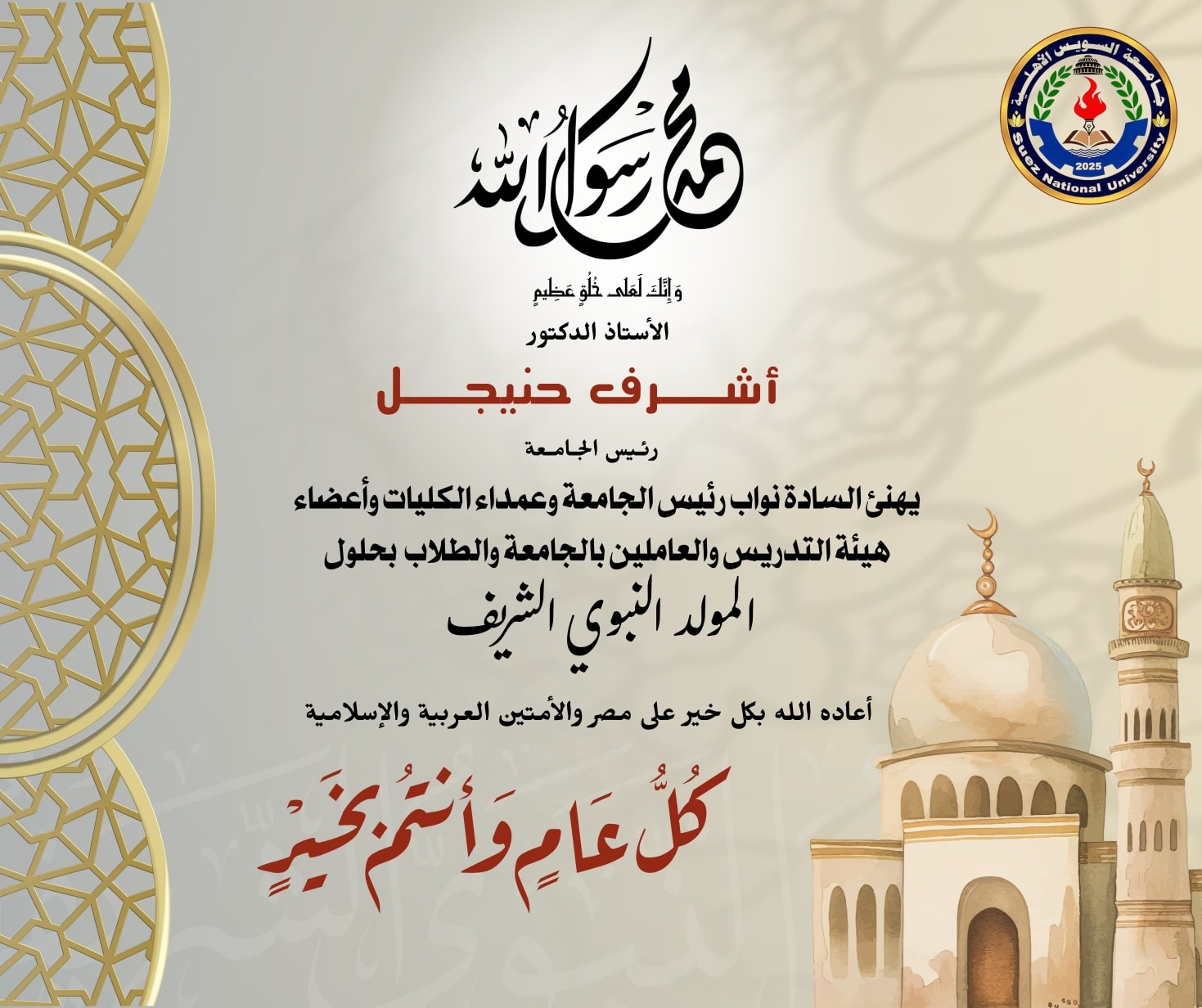 تهنئة بمناسبة المولد النبوي الشريف من رئيس جامعة السويس الأهلية