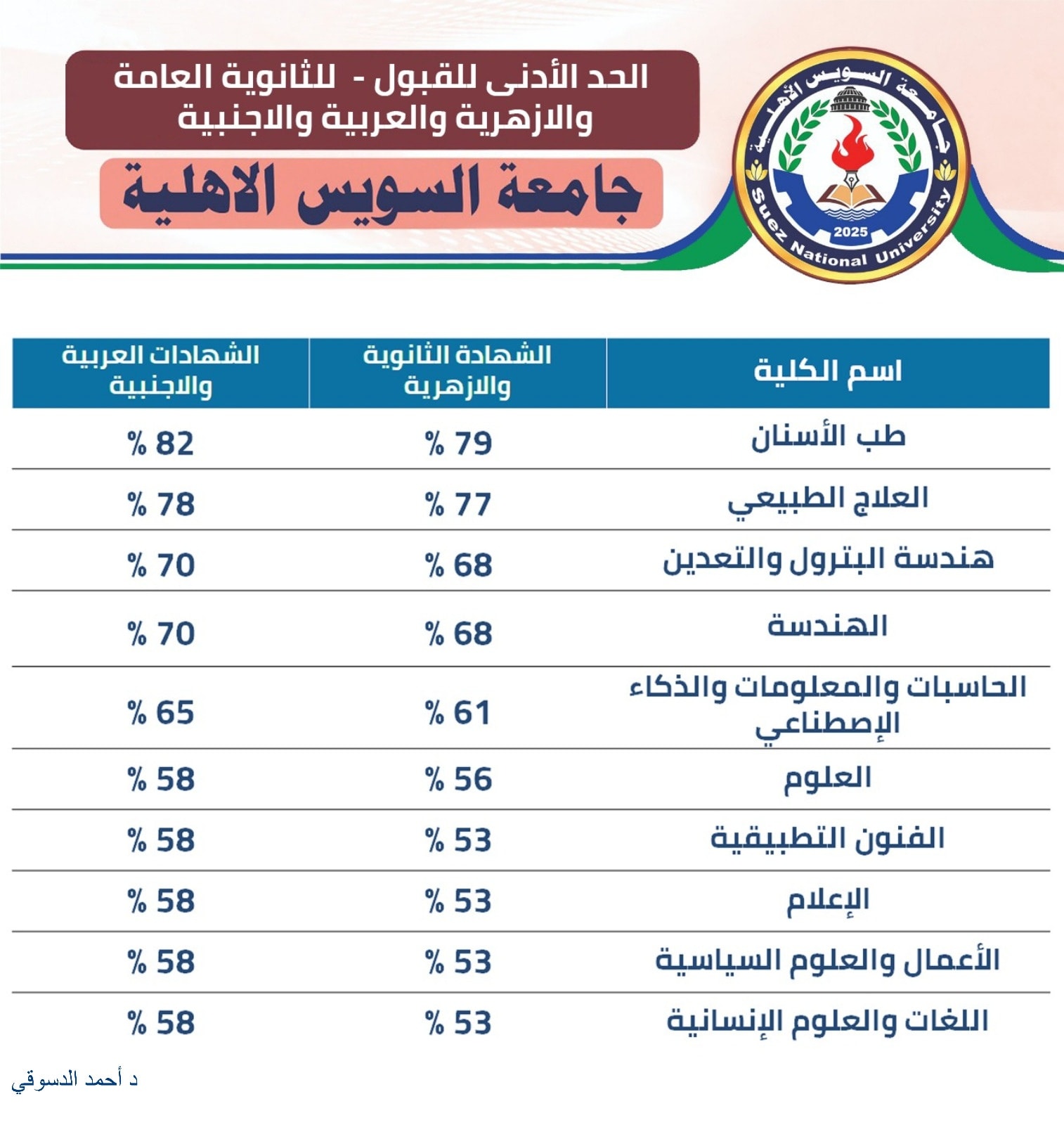 جامعة السويس الأهلية تعلن الحدود الدنيا للقبول بالكليات والبرامج