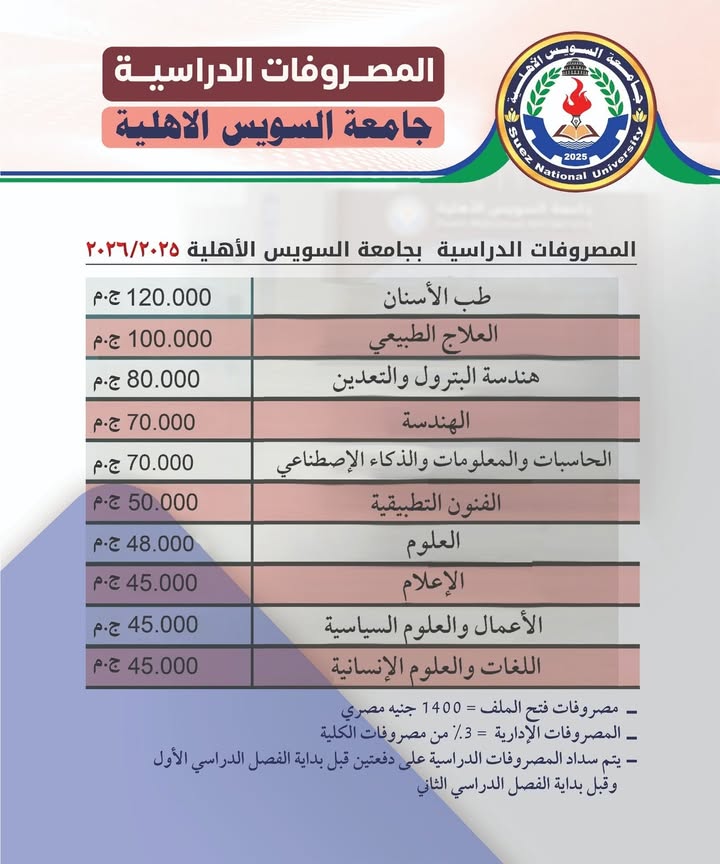 جامعة السويس الأهلية تعلن عن أماكن شاغرة بعدد من الكليات للطلاب الحاصلين على الشهادات الفنية